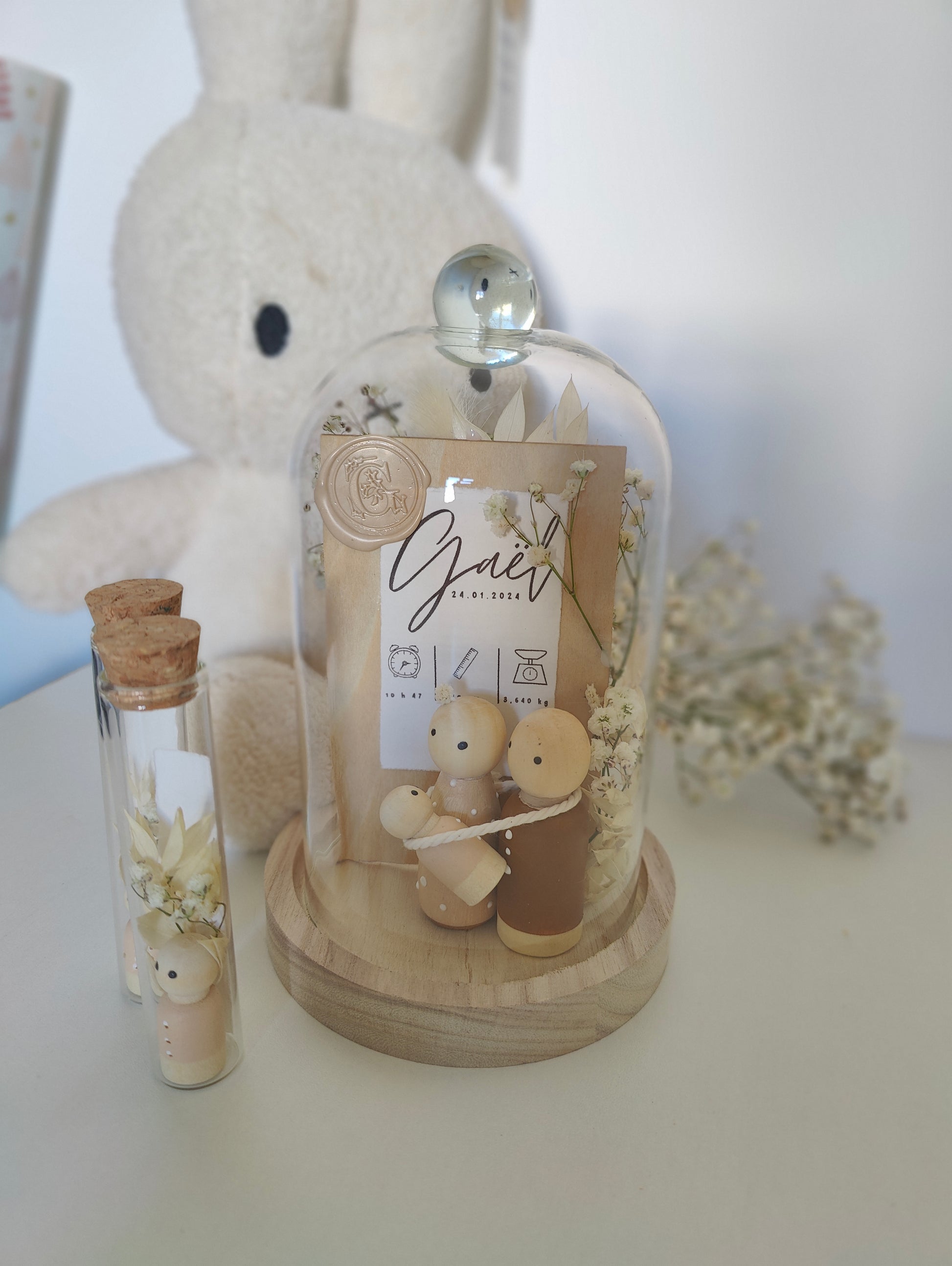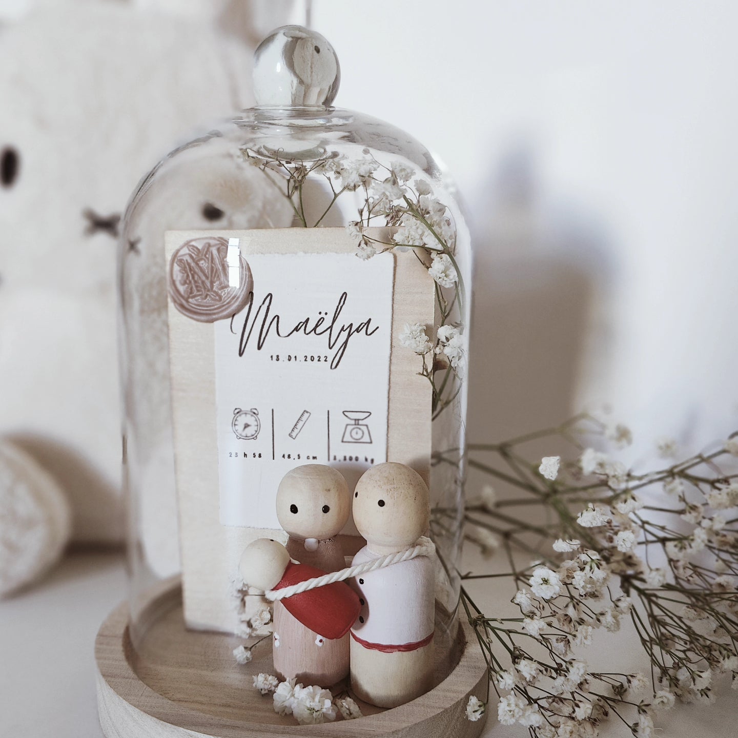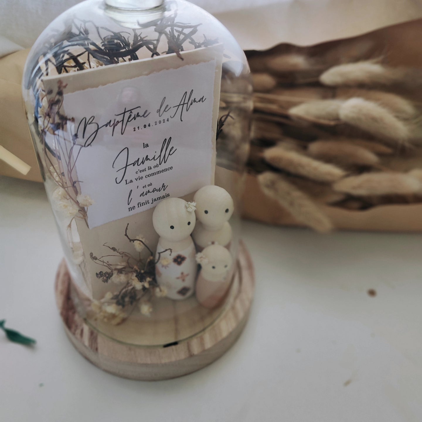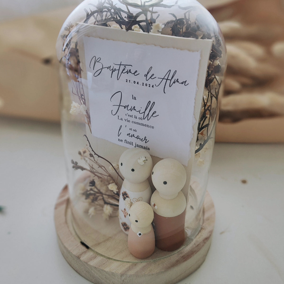 • Poupées personnalisées : Poupées en bois sont soigneusement peintes et positionnées dans la cloche. A vous de choisir la couleur.