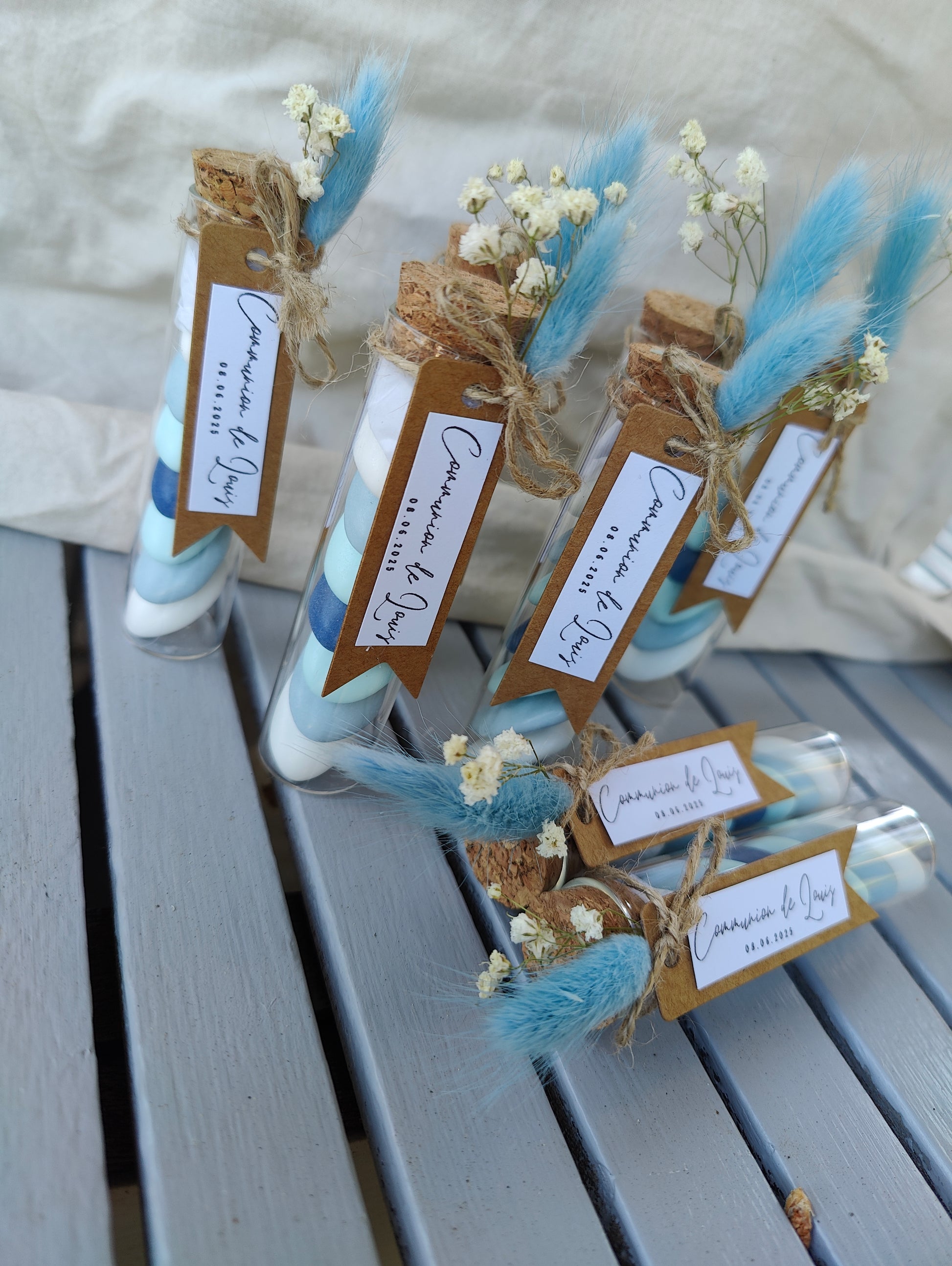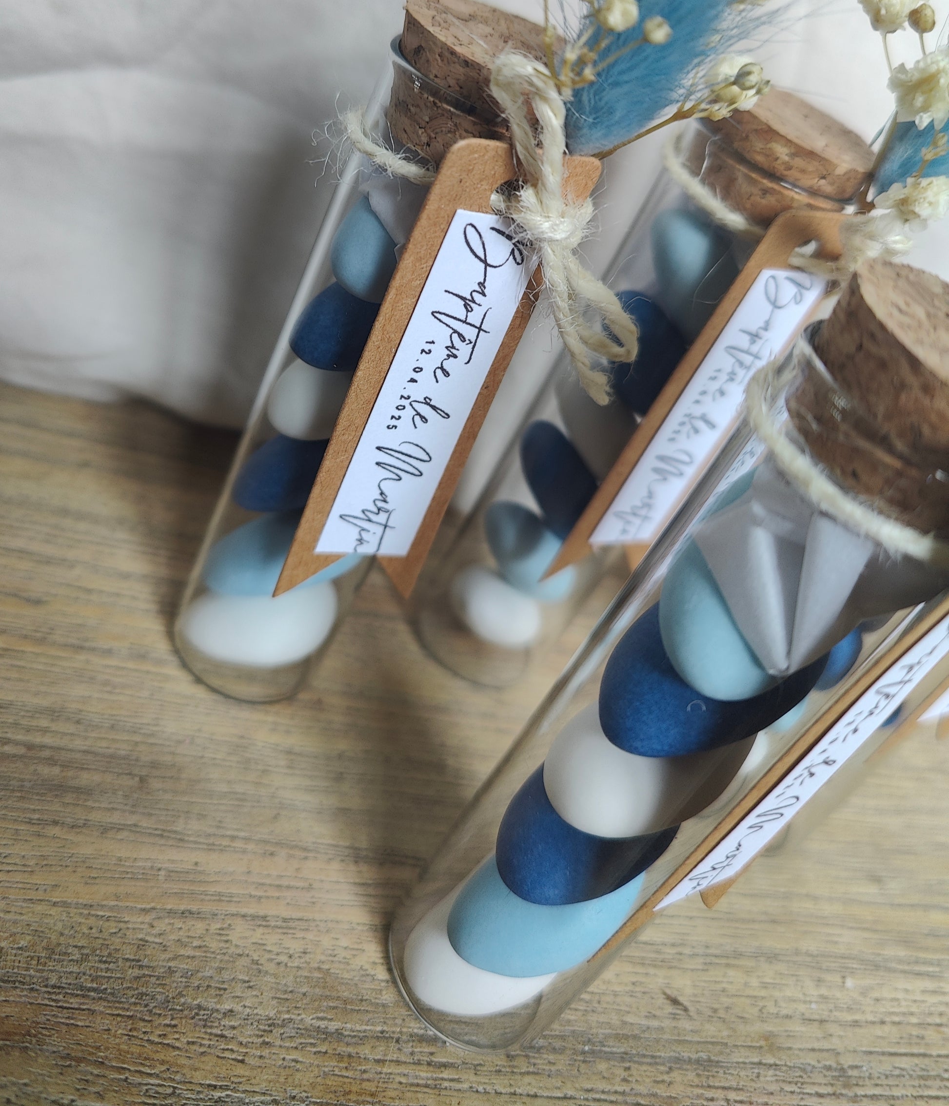 Chaque éprouvette contient un mélange harmonieux de dragées dans les tons bleu et blanc soigneusement disposées dans un tube transparent refermé avec un bouchon en liège naturel. Pour un rendu raffiné, l’éprouvette est décorée d’un petit bouquet de fleurs séchées, d’un ruban en kraft et d’une étiquette personnalisée (prénom, événement, date).